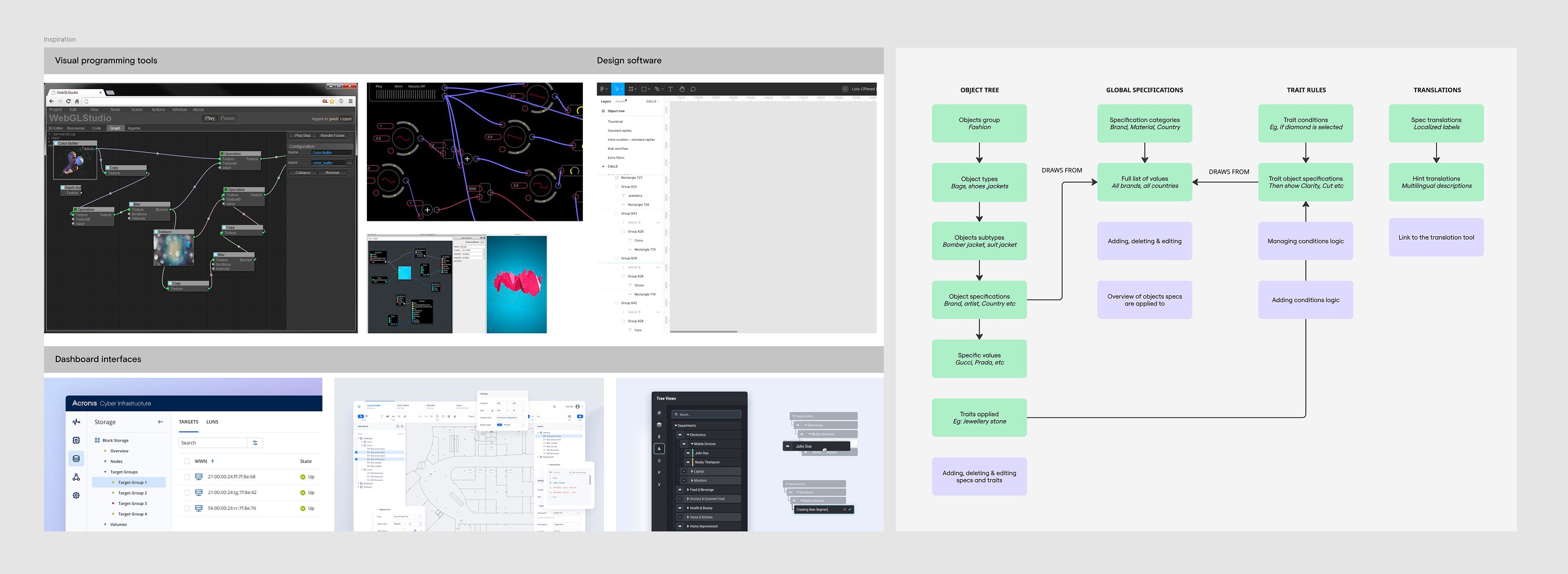 Inspired by component systems in tools like Figma, object types were nested under parent groups that automatically inherited shared properties. The team could update attributes once at the parent level and apply the change across all child objects. It significantly reduced repetitive work.