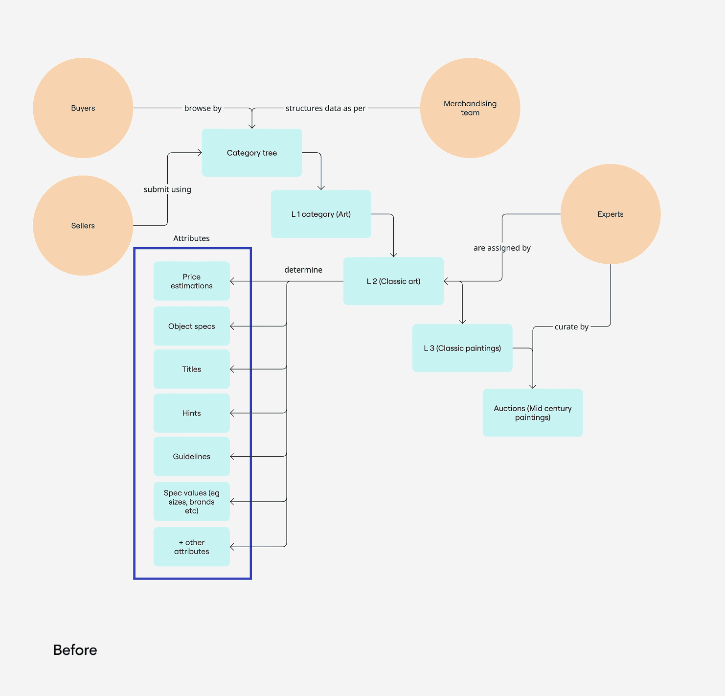 Before designing the tool, I worked with product and commercial teams to map how the systems would change. In the new structure, object attributes shown in the seller listing flow would be tied to objects instead of categories. The tool therefore needed to manage a much wider set of attributes and relationships. Mapping these connections helped define the capabilities the tool needed to support.